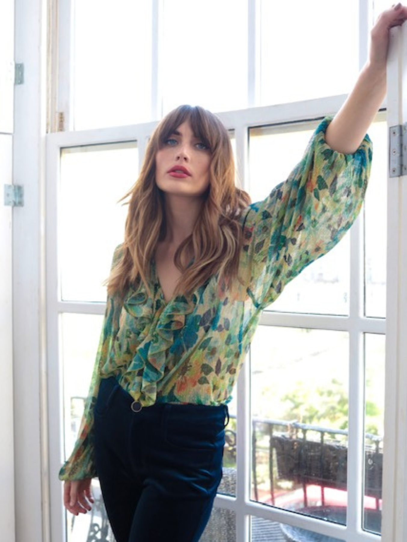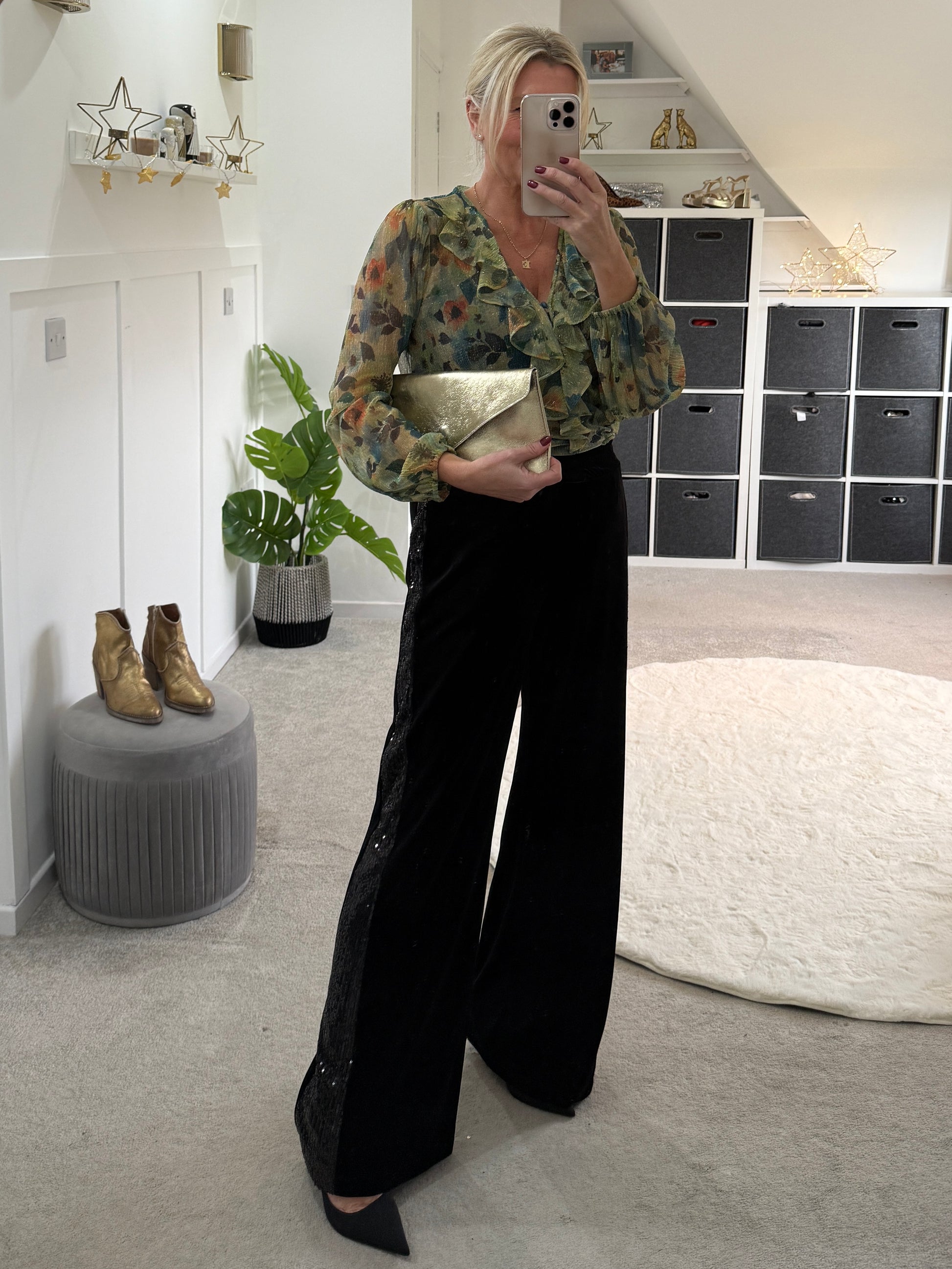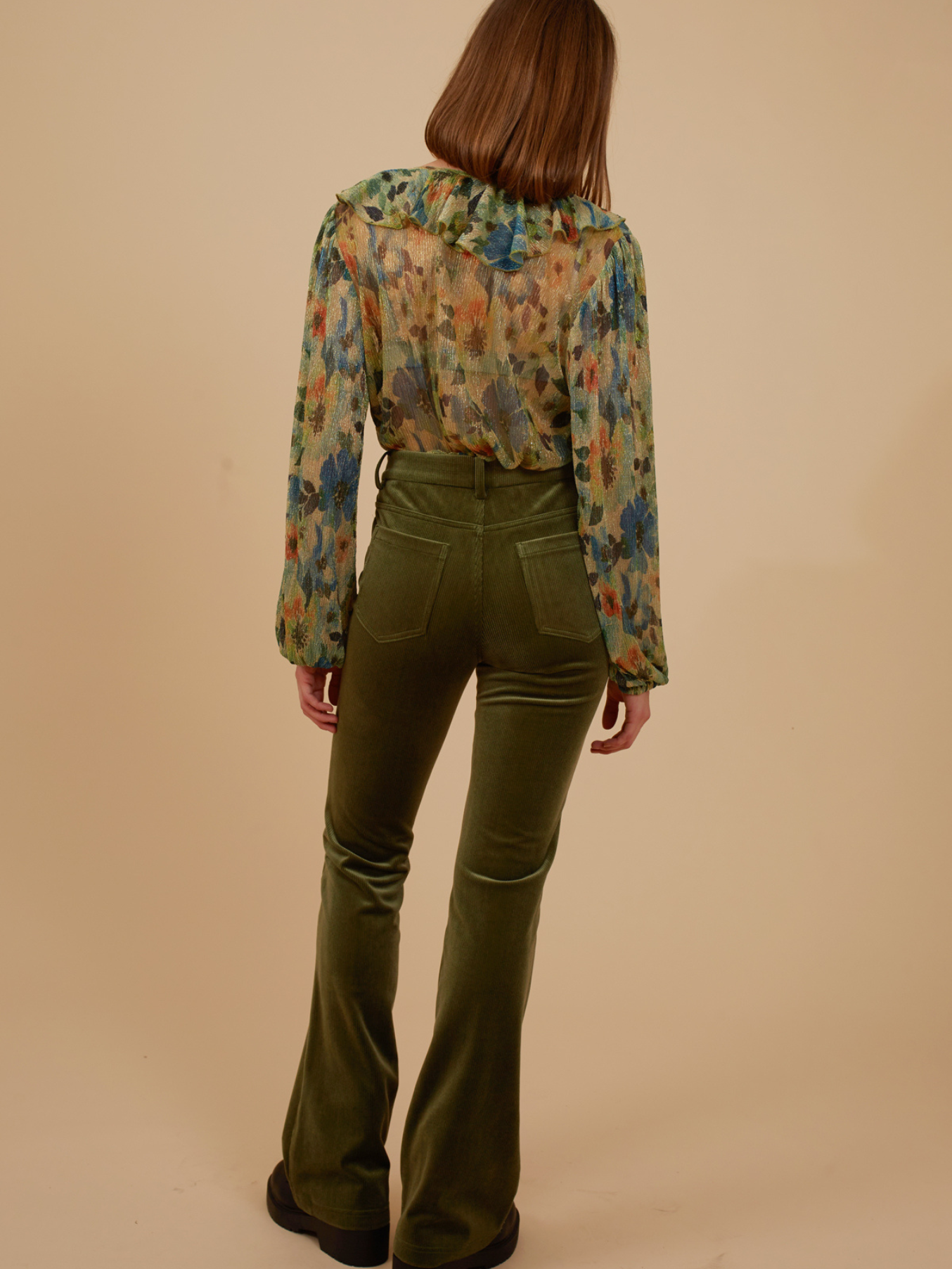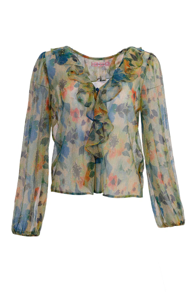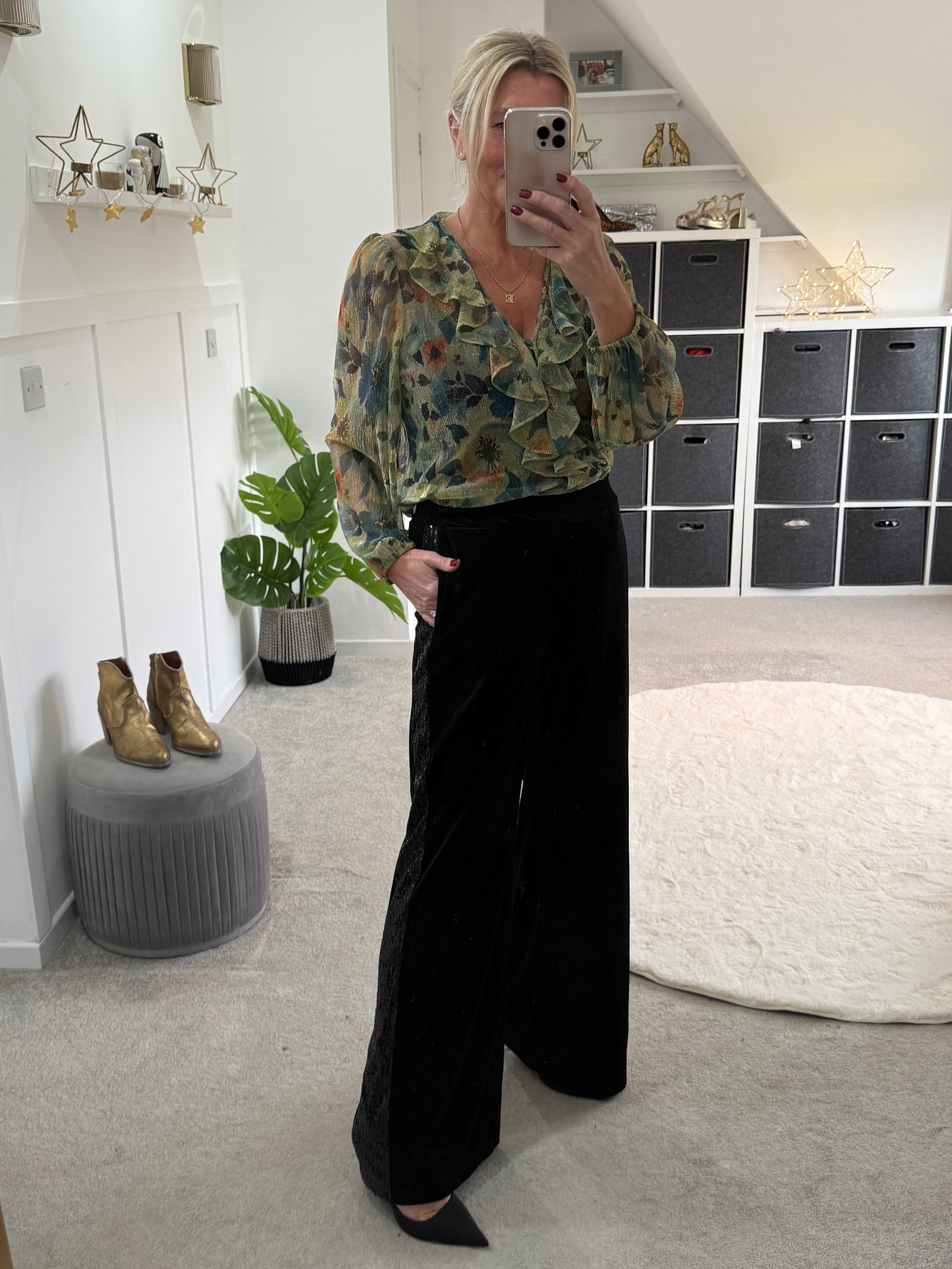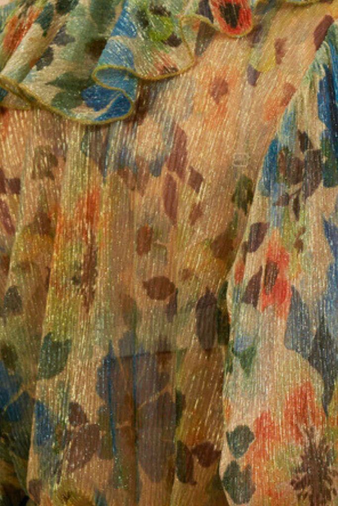 This long sleeved blouse has a beautiful frill collar following the neckline, with a stunning deep V-neck. Featured in this beautiful blue and green print with a gorgeous gold shimmer to it.